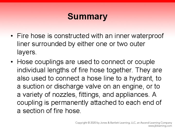 Summary • Several techniques are used for connecting and disconnecting hose couplings. Depending on the circumstances, one technique may be more effective than another. • Fire hose are used as supply hose and as attack hose.
