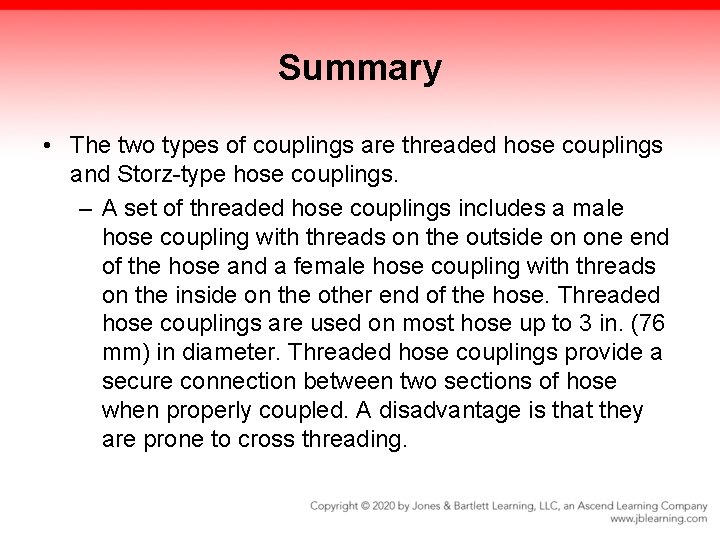 Summary • The two types of couplings are threaded hose couplings and Storz-type hose couplings. – A set of threaded hose couplings includes a male hose coupling with threads on the outside on one end of the hose and a female hose coupling with threads on the inside on the other end of the hose. Threaded hose couplings are used on most hose up to 3 in. (76 mm) in diameter. Threaded hose couplings provide a secure connection between two sections of hose when properly coupled. A disadvantage is that they are prone to cross threading.