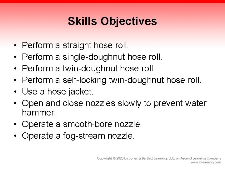 Skills Objectives • • • Perform a straight hose roll. Perform a single-doughnut hose roll. Perform a twin-doughnut hose roll. Perform a self-locking twin-doughnut hose roll. Use a hose jacket. Open and close nozzles slowly to prevent water hammer. • Operate a smooth-bore nozzle. • Operate a fog-stream nozzle.