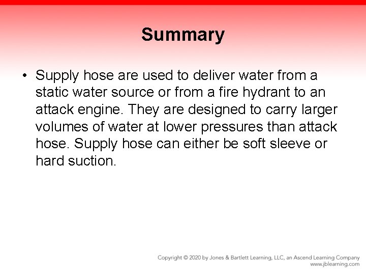 Summary • Supply hose are used to deliver water from a static water source or from a fire hydrant to an attack engine. They are designed to carry larger volumes of water at lower pressures than attack hose. Supply hose can either be soft sleeve or hard suction.