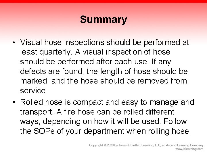 Summary • Visual hose inspections should be performed at least quarterly. A visual inspection of hose should be performed after each use. If any defects are found, the length of hose should be marked, and the hose should be removed from service. • Rolled hose is compact and easy to manage and transport. A fire hose can be rolled different ways, depending on how it will be used. Follow the SOPs of your department when rolling hose.