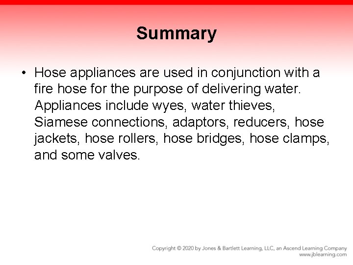 Summary • Hose appliances are used in conjunction with a fire hose for the purpose of delivering water. Appliances include wyes, water thieves, Siamese connections, adaptors, reducers, hose jackets, hose rollers, hose bridges, hose clamps, and some valves.