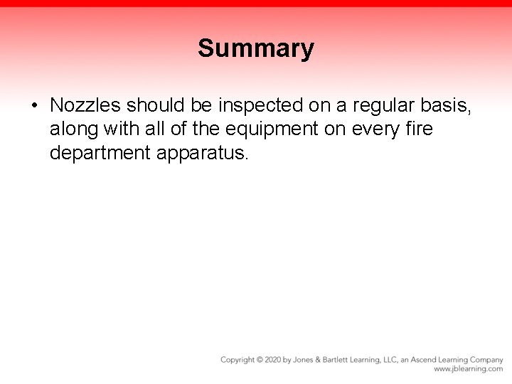 Summary • Nozzles should be inspected on a regular basis, along with all of the equipment on every fire department apparatus.