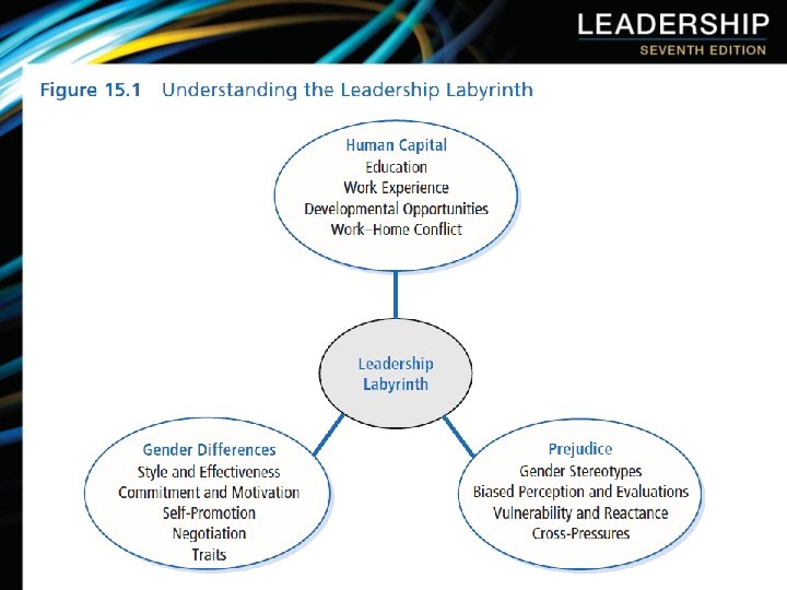Understanding the Labyrinth 1. Human Capital Differences ÷ Pipeline Problem – Women have less education, training, and work experience than men resulting in a dearth of qualified women. ÷ Pipeline is not empty but leaking – Explanation that women haven’t been in managerial positions long enough for natural career progression to occur (Heilman, 1997) ; not supported by research. ÷ Division of labor – Explanation that women self-select out of leadership tracks by choosing “mommy track” positions that do not funnel into leadership positions (Belkin, 2003; Ehrlich, 1989; Wadman, 1992); not supported by research (Eagly & Carli, 2004). Peter G. Northouse, Leadership: Theory and Practice, Seventh Edition. © 2016 SAGE Publications, Inc.