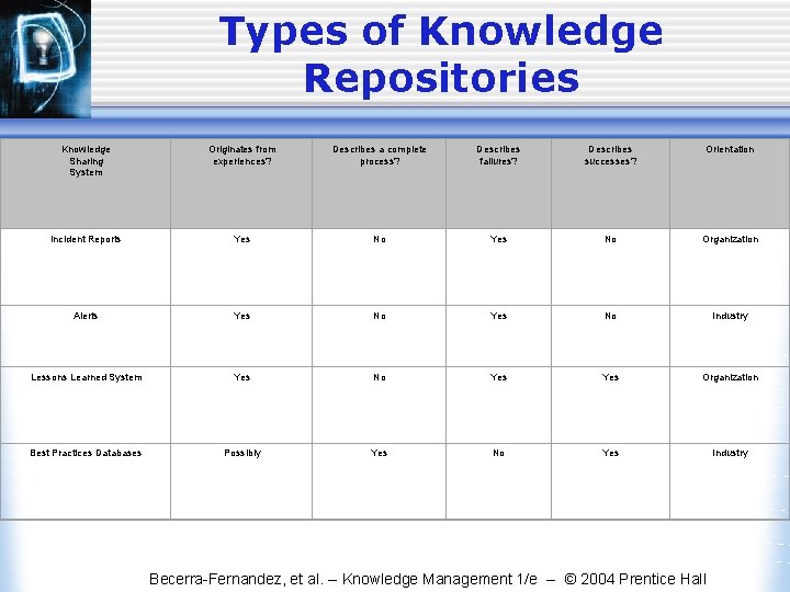 Types of Knowledge Repositories Knowledge Sharing System Originates from experiences? Describes a complete process? Describes failures? Describes successes? Orientation Incident Reports Yes No Organization Alerts Yes No Industry Lessons Learned System Yes No Yes Organization Best Practices Databases Possibly Yes No Yes Industry Becerra-Fernandez, et al. -- Knowledge Management 1/e -- © 2004 Prentice Hall