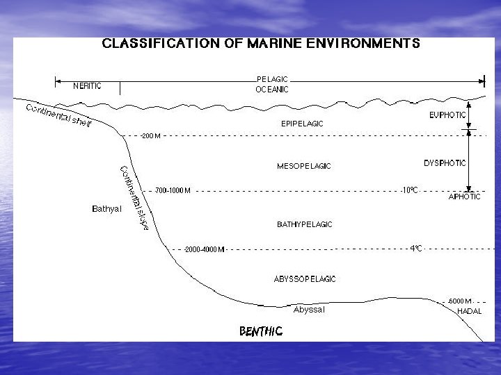 Life Near the Surface • Pelagic – water column away from bottom or shore • Epipelagic – sea surface to depth of about 200 meters – The epipelagic can be divided into (1) neritic waters over the continental shelf and (2) oceanic waters that are not over the continental shelf