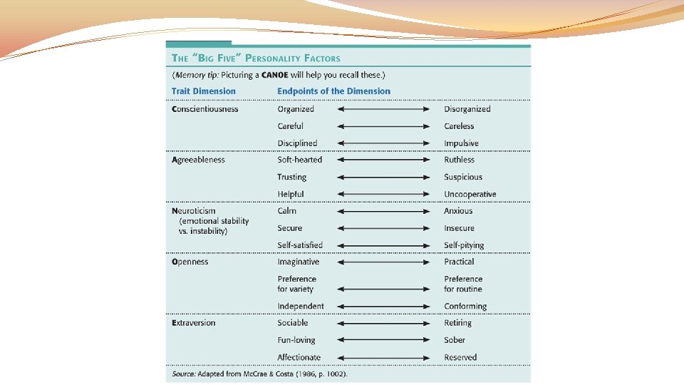 The Big-Five Model �Paul Costa & Robert Mc. Crae felt that Raymond Cattell identified too many traits and Hans Eysenck too few �Currently the most widely accepted model of traits �Used factor analysis to develop five central source traits • Openness • Conscientiousness • Extraversion • Agreeableness • Neuroticism • Research has shown these traits to be stable in adulthood, influenced by genetics, and a predictor of behavior.