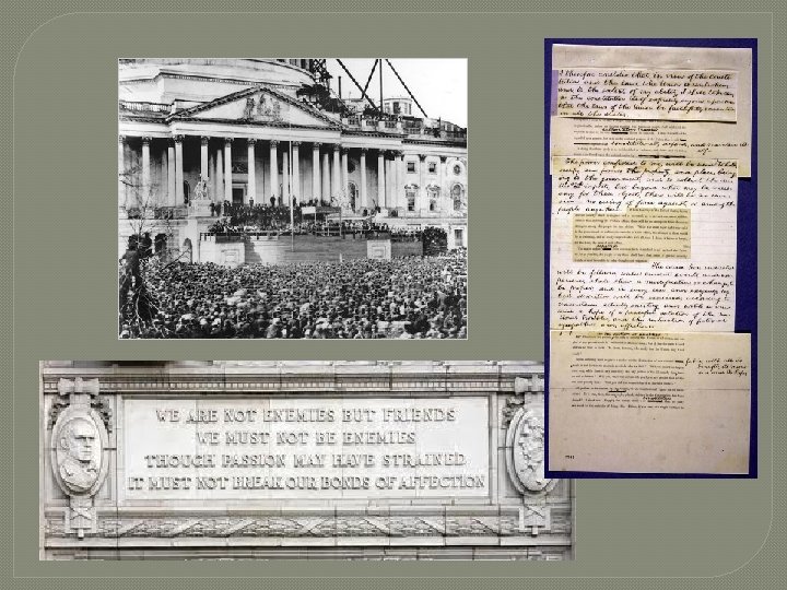 Efforts to Compromise Fail � What was the purpose of the Crittenden Plan? Was it successful? • To compromise with the southern states who seceded • No, it did not pass � How did Lincoln try to reassure the South in his First Inaugural Address on March 4, 1861? • He assured them he had no intention of abolishing slavery in the South • Ended his speech with an appeal for friendship