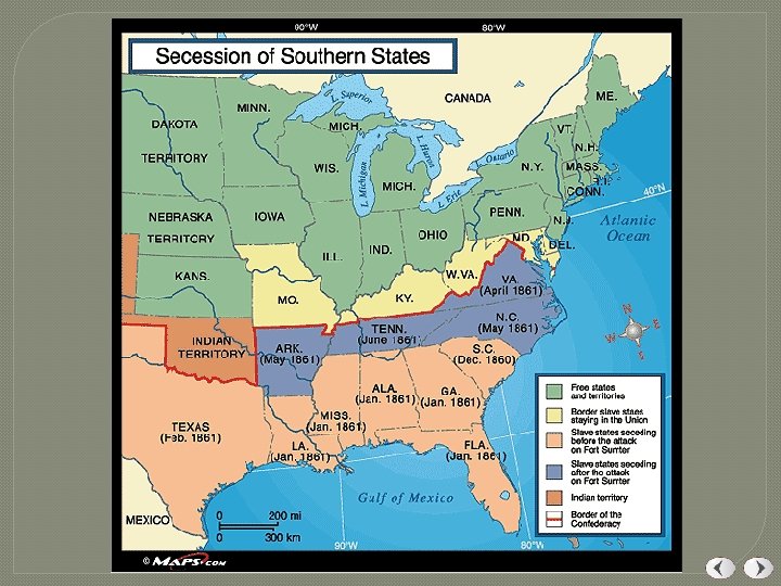 Key Terms � Platform – a statement of beliefs � Secede – to withdraw � Confederate States of America – the confederation formed in 1861 by the Southern states after their secession from the Union � Jefferson Davis – named president of the Confederacy � Crittenden Plan – a compromise introduced in 1861 that might have prevented secession; sponsored by Senator John J. Crittenden of Kentucky � Civil war - a war between opposing groups of the same country