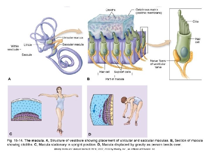 SENSES OF HEARING AND BALANCE: THE EAR (cont. ) l Sense of balance ¡ Static equilibrium: ability to sense head position relative to gravity or acceleration/deceleration (Figure 15 -14) l Movements of the maculae, located in both the utricle and saccule, provide information related to head position or acceleration l Otoliths are located within the matrix of the macula l Changing head position produces a change of pressure on the otolith-weighted matrix, stimulating the hair cells that stimulate the receptors of the vestibular nerve l Vestibular nerve fibers conduct impulses to the brain and sense head position and a change in the pull of gravity l Righting reflexes: muscular responses to restore the body and its parts to their normal position when displaced; caused by stimuli of the macula and impulses from proprioceptors and from the eyes