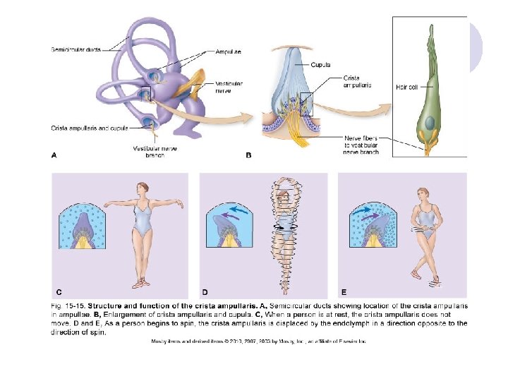 SENSES OF HEARING AND BALANCE: THE EAR (cont. ) ¡ Dynamic equilibrium: needed to maintain balance when the head or body is rotated or suddenly moved; able to detect changes in direction and rate at which movement occurs (Figure 15 -15) l Depends on the functioning of the cristae ampullaris, located in the ampulla of each semicircular duct l Cupula: gelatinous cap where the hair cells of cristae are embedded • Does not respond to gravity • Moves with the flow of endolymph in the semicircular ducts l Semicircular ducts are arranged at nearly right angles to each other to detect movement in all directions l Hair cells bend as cupula moves, producing a receptor potential followed by an action potential • Action potential passes through the vestibular portion of the eighth cranial nerve to the medulla oblongata • Sent next to other areas of the brain and spinal cord for interpretation, integration, and response