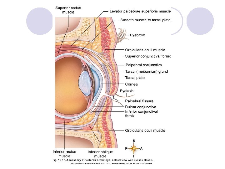 VISION: THE EYE l Structure of the eye (Figures 15 -16 to 1525) ¡Accessory structures (Figures 15 -16 to 15 -20) l. Eyebrows and eyelashes give some protection against foreign objects entering the eye; cosmetic purposes l. Eyelids consist of voluntary muscle and skin • Lined with conjunctiva, a mucous membrane • Palpebral fissure: opening between the eyelids • Angle or canthus: where the upper and lower eyelids join