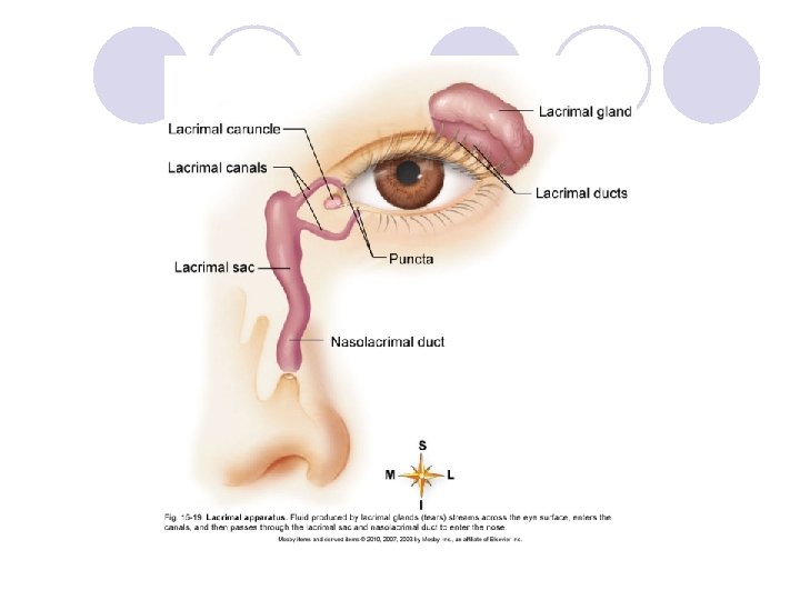 VISION: THE EYE (cont. ) l. Lacrimal apparatus: structures that secrete tears and drain them from the surface of the eyeball (Figure 15 -19) • Lacrimal glands: size and shape of a small almond Located at the upper, outer margin of each orbit Approximately 12 small ducts lead from each gland Drain tears onto the conjunctiva • Lacrimal canals: small channels that empty into lacrimal sacs • Lacrimal sacs: located in a groove in the lacrimal bone • Nasolacrimal ducts: small tubes that extend from the lacrimal sac into the inferior meatus of the nose