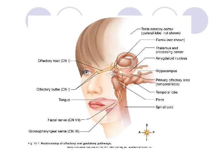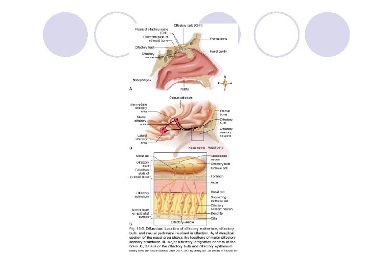 SENSE OF SMELL (cont. ) l Olfactory pathway: when the level of odorproducing chemicals reaches a threshold level, the following occur (Figure 15 -7): ¡Receptor potential and then action potential are generated and passed to the olfactory nerves in the olfactory bulb ¡The impulse then passes through the olfactory tract and into the thalamic and olfactory centers of the brain for interpretation, integration, and memory storage