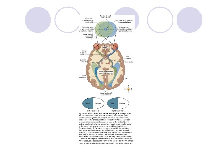 VISION: THE EYE (cont. ) ¡Neural pathway of vision (Figure 15 -30) l. Fibers that conduct impulses from the rods and cones reach the visual cortex in the occipital lobes by way of the optic nerves, optic chiasma, optic tracts, and optic radiations l. Optic nerve contains fibers from only one retina, but optic chiasma contains fibers from the nasal portion of both retinas; these anatomical facts explain peculiar visual abnormalities that sometimes occur