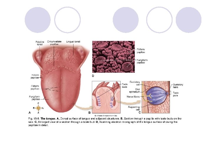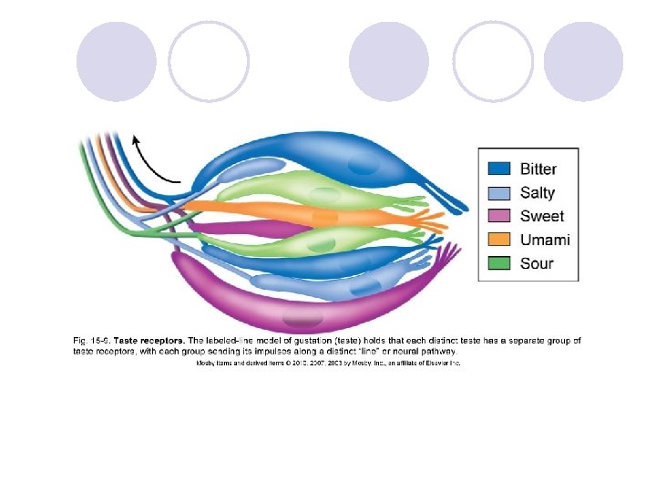 SENSE OF TASTE l Taste buds: sense organs that respond to gustatory (taste) stimuli; associated with papillae ¡ Chemoreceptors stimulated by chemicals dissolved in the saliva ¡ Gustatory cells: sensory cells in taste buds ¡ Sense of taste depends on the creation of a receptor potential in gustatory cells because of taste-producing chemicals in the saliva ¡ Taste buds are similar structurally; functionally, each taste bud responds most effectively to one of five primary taste sensations: sour, sweet, bitter, umami, and salty (and perhaps others, such as metallic) (Figures 15 -8 and 15 -9) ¡ Adaptation and sensitivity thresholds differ for each primary taste sensation
