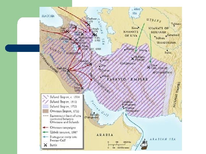 Safavids l l l After Tamerlane (Mongol) decline- chaos Founded by Shah Ismail- ancestor to Ali Controlled Iraq, Iran, Baghdad Conflict with Ottoman Turks Copied Janissaries, military from Ottomans Abbas the Great- strengthen, stabilize dynasty