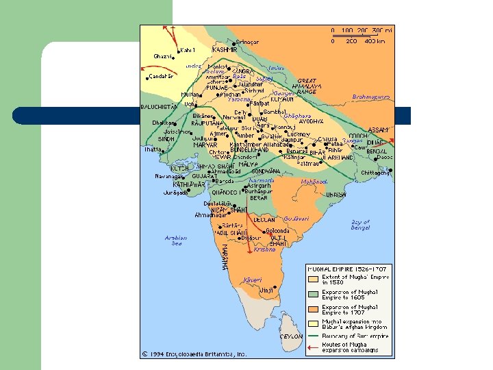 Mughals l l l Unification of subcontinent of India- under Islamic foreigners Influence of Europeans- decline Founder was Babul (Mongol descendent) Weapons, cavalry- northern India Son chased out but aided by Safavids to return to power Akbar- peak of power, “gunpowder empire”