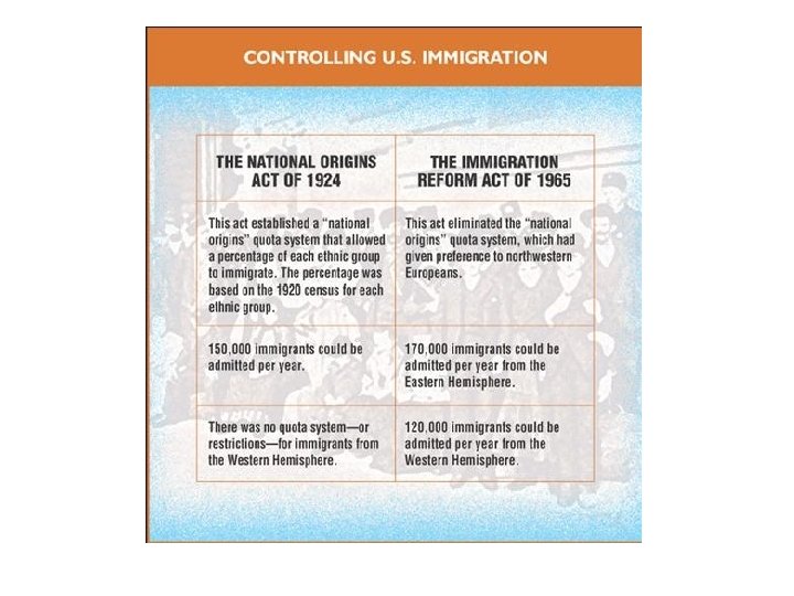 e. Inner City programs - combated deteriorating inner cities - created Dept of Housing and Urban Development 1965. Robert Weaver = 1 st black American in a Cabinet post f. Immigration Reform Act 1965: - strict limit on # of immigrants allowed into US per year - eliminated the national origins system, which gave preference to northern European immigrants - thus, increased immigration from Asia, Africa and Latin America