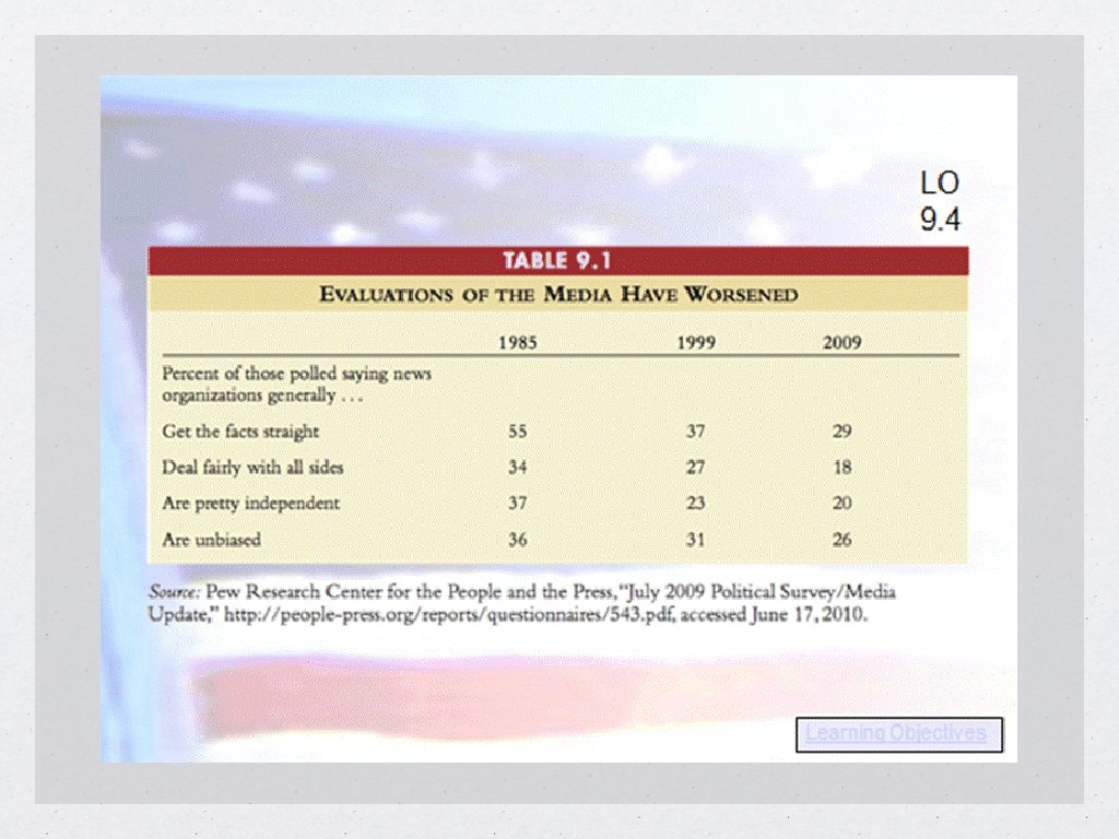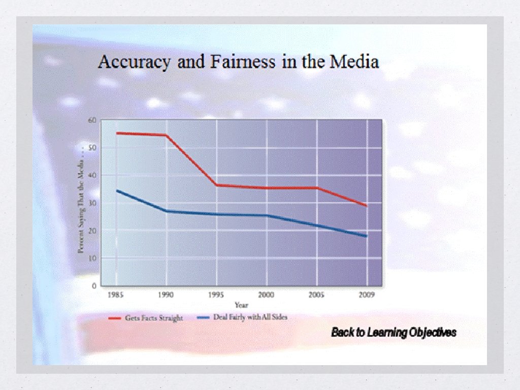 Public’s Perception of the Media Public opinion of media is relatively critical Perceive media to be: Politically biased Roadblocks to solving problems Inaccurate in their reporting Unwilling to admit mistakes Most still view the national news media as credible Terrorist attacks shifted public opinion positively for a period Value the watchdog role of the news media