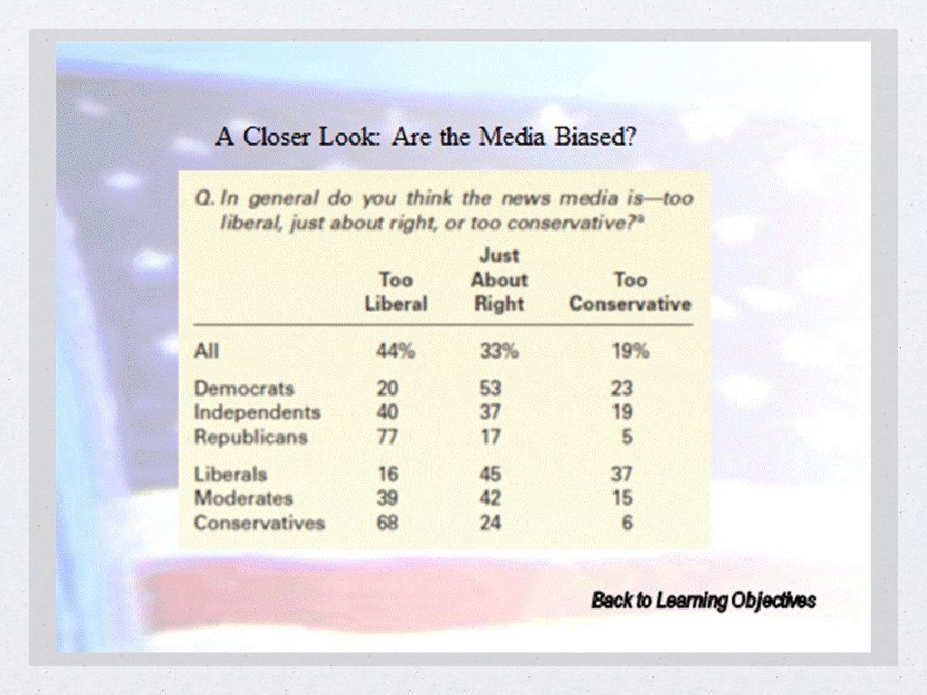 1980 s and 1990 s argument that media was liberally biased because of sheer number of journalist who leaned to the left Another argument focuses on corporate interests and the influence on what is covered Media critics: focus on national media’s lack of skepticism regarding the invasion of Iraq Recent media bias is intentional and a response to increasing fragmentation and competition among media Mainstream media losing market share while online and alternative media are growing Market position CNN: 27% of Democrats, 20% of Republicans Fox News: 29% of Republicans, 14% of Democrats Ideological fragmentation is viewed as a negative trend by those who believe that the mass media are essential to providing the facts to educate the public about politics