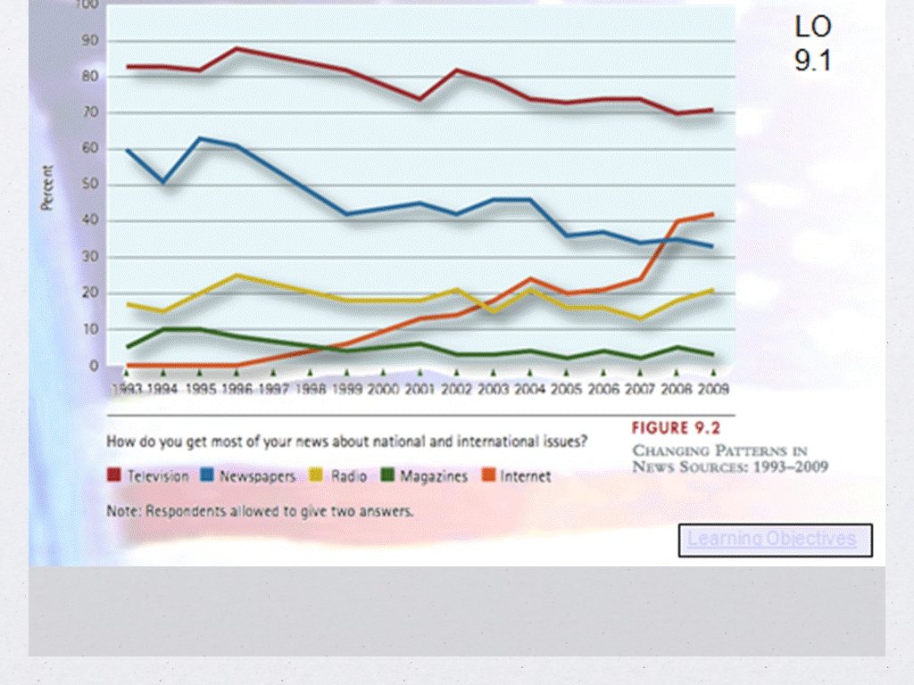 Radio News Is largely a headline service (but without TV’s pictures) All-news stations provide some more coverage but are repetitious Talk-radio has become an important political force in recent years. Newspapers Have lost their place as the dominate news source Often set the agenda for broadcast news sources Continue to be the primary source of news for the educated and influential