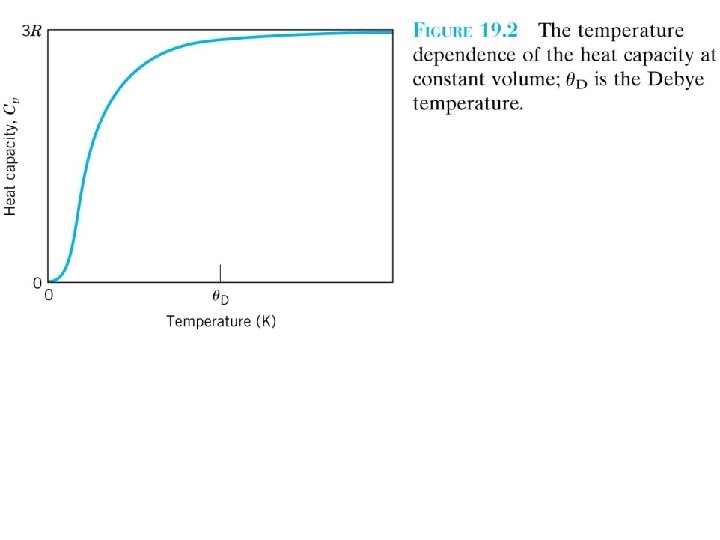 TEMPERATURE DEPENDECE OF THE HEAT CAPACITY C is zero at 0 K, but it rises rapidly with temperature. (19. 2 ) F. 19. 2 Where A is a temperature-independent constant. Above, what is called the Debye temperature D, C levels off and becomes essentially independent of temperature at a value of approximately 3 R, R being the gas constant. The value of D is below room temperature for many solid materials, and 25 J/mol-K (6 cal/mol-K) is a reasonable roomtemperature approximation for C .