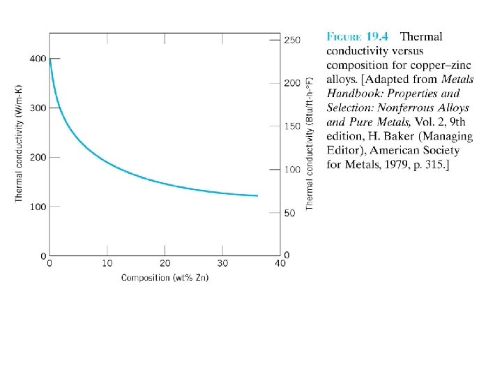 The theoretical value of L, Alloying metals with impurities results in a reduction in thermal conductivity, for the same reason that the electrical conductivity is diminished. The impurity atoms act as scattering centers, e. g. , copper-zinc alloys (Figure 19. 4), stainless steels. F 19. 4 Ceramics F 12. 21 F 12. 23 They lack large numbers of free electrons. Thus the phonons are primarily responsible for thermal conduction: is much smaller than. Phonons are not as effective as free electrons in the transport of heat energy as a result of the very efficient phonon scattering by lattice imperfections.