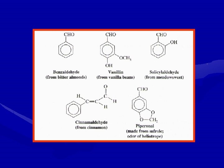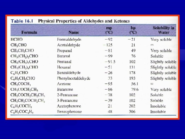 Physical Properties • The carbonyl group is a polar group; therefore, aldehydes and ketones have higher boiling points than hydrocarbons of the same molecular weight. • However, since aldehydes and ketones cannot have strong hydrogen bonds between their molecules they have lower boiling points than the corresponding alcohols.