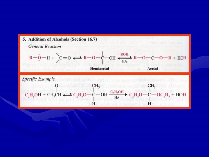 • Acetal formation is not favored when ketones are treated with simple alcohols and gaseous HCl. • Cyclic acetal formation is favored, when a ketone is treated with an excess of a 1, 2 -diol and a trace of acid. • This reaction, too, can be reversed by treating the acetal with aqueous acid.