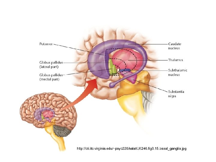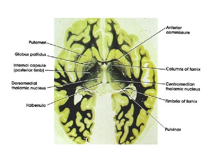 Some Nomenclature • GPi thalamus output pathway – Ansa lenticularis • Fibers loop ventrally under IC – Lenticular fasciculus • Fibers penetrate straight through IC – Join to form thalamic fasciculus • GPe Subthalamic nucleus and GPi – Subthalamic fasciculus