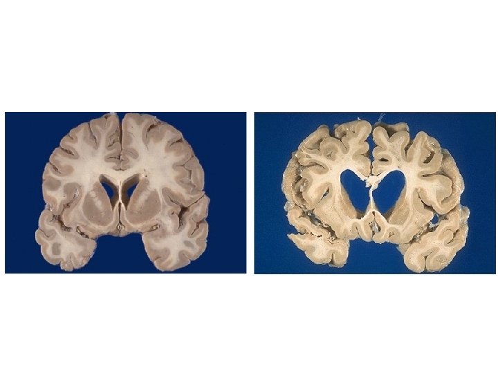 Huntington’s Disease • Autosomal dominant inheritance pattern – Gene on chromosome 4, CAG trinuc repeats • 4 -5/100, 000, usu age of onset 30 -50 y. o. • Progressive atrophy of striatum – Caudate > putamen > Nacc – All 4 functions of BG affected • Cortical atrophy later in course • Diagnosis – Clinical features, family Hx, genetic testing