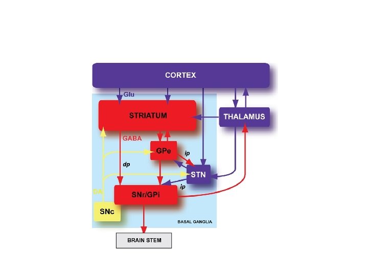 Direct pathway • • • From striatum directly to SNpr, GPi Cortex stimulates striatum Striatum inhibits SNpr, GPi Loss of inhibition of thalamus Facilitation of movement via increased thalamic output to motor and premotor cortex