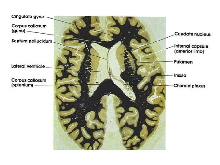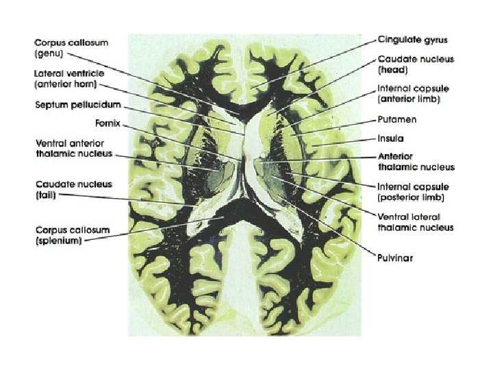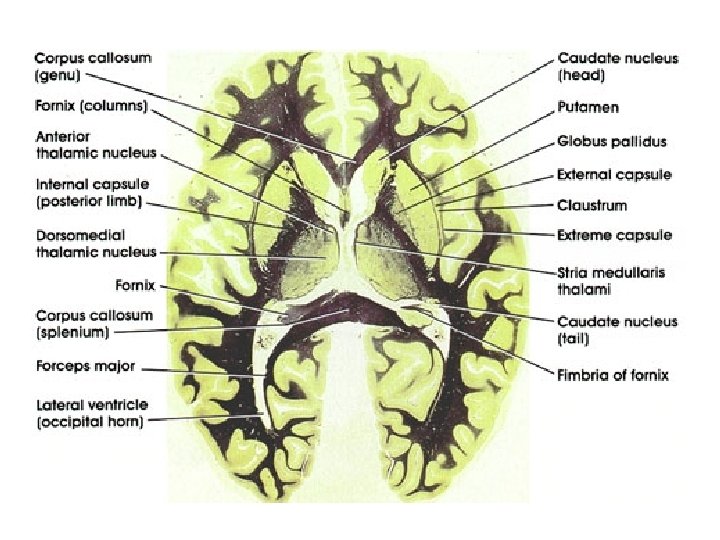 Anatomy • Relationships – Head of caudate + lentiform nucleus separated by Anterior limb of internal capsule – Lentiform nucleus and thalamus separated by Posterior limb internal capsule – So: • Caudate and thalamus always medial to IC • Putamen and GP always lateral to IC