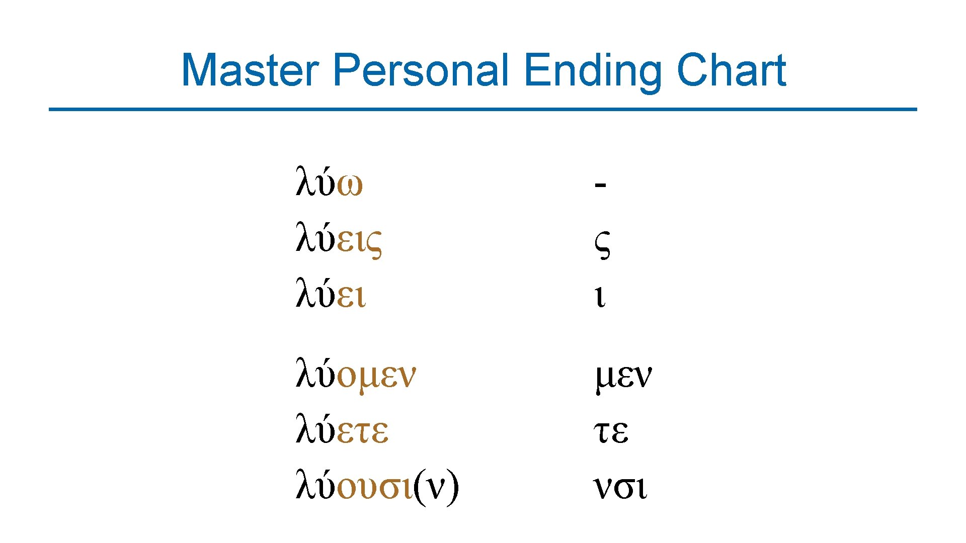 Present Active Indicative λύω λύεις λύει I am loosing You are loosing He/she/it is loosing ο ε ε ς ι λύομεν λύετε λύουσι(ν) We are loosing You are loosing They are loosing ο ε ο μεν τε νσι