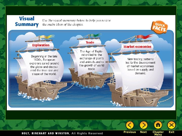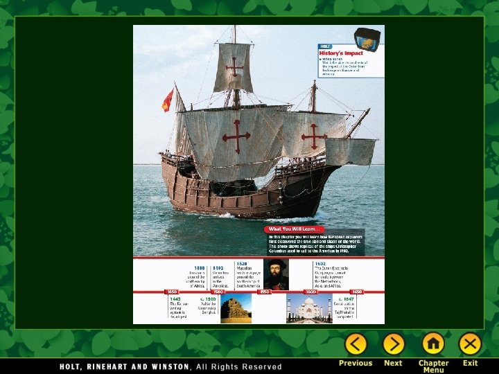 Chapter 16 – The Age of Exploration Section Notes Video Great Voyages of Discovery The Columbian Exchange Origins of Capitalism The Columbian Exchange History Close-up The Caravel Quick Facts The Columbian Exchange Effects of Exploration Supply and Demand Chapter 16 Visual Summary Maps European Exploration Mapping New Worlds The Columbian Exchange World Trade Patterns, 15001800 Assessment Map Images Ships of Christopher Columbus Mapping New Worlds New Technologies