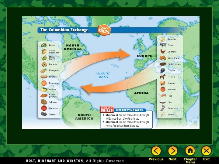 The Columbian Exchange • The exchange of plants, animals, and ideas between the New World (the Americas) and the Old World (Europe) is known as the Columbian Exchange. • Exchanges occurred when Europeans took seeds to plant crops in the New World. • Europeans also took animals such as cows, goats, sheep, horses, and chickens to the New World. • Accidental exchanges took place when Europeans brought over diseases or animals such as rats that hid in ships.