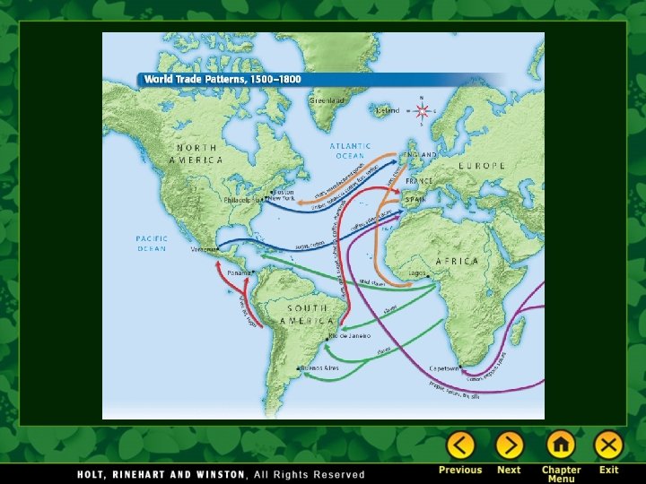 New Trading Patterns • One major trading pattern involved the exchange of raw materials, manufactured products, and slaves among Europe, Africa, and the Americas. This type of trade was called triangular trade. • The Atlantic slave trade was a major part of the trade network. The Portuguese, Dutch, and English were all active in the slave trade. • Between the 1500 s and 1600 s, millions of slaves were shipped to the colonies in the New World. Enslaved Africans were crammed onto ships and sent mainly to South America and the Caribbean.