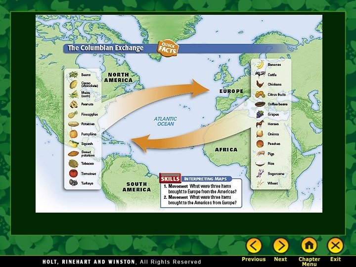 The Columbian Exchange 7. 11. 2 The Big Idea The exchange of plants, animals, ideas, and technology between the Old World and the New World brought many changes all over the world. Main Ideas • Plants and animals were exchanged among Europe, Asia, Africa, and the Americas. • Culture and technology changed as ideas were exchanged between Europe and the Americas. • Society and the economy changed in Europe and the Americas.