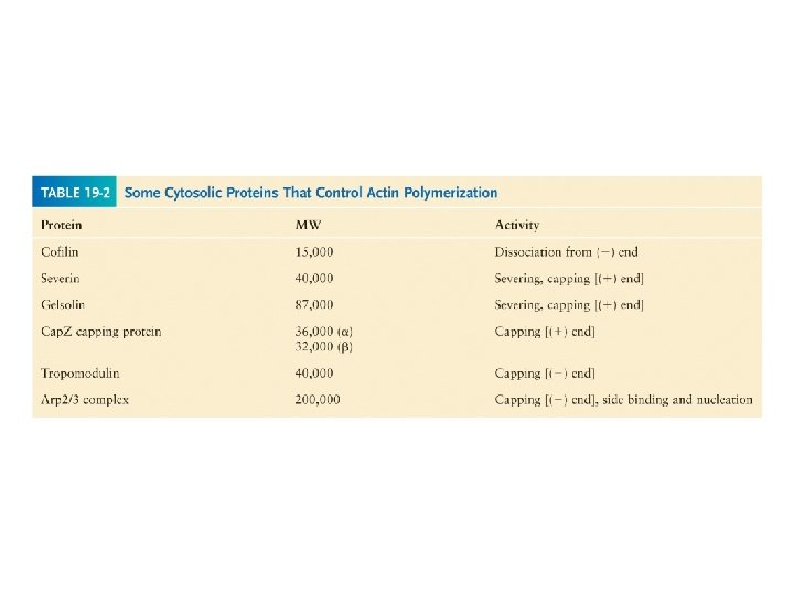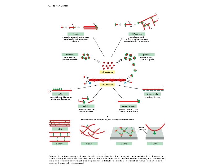 Filament elongation is modified by proteins that bind to the free subunits Why does the soluble actin in cells not polymerized into filaments if the concentration of soluble actin is high (50 -200 m. M)? Although the Cc of actin monomers is 0. 1 m. M, the actin is not polymerized as it is bound to special proteins, such as thymosin. Actin monomers bound to thymosin are locked where they cannot associate with either the (+) end or (-) end of the actin filament.