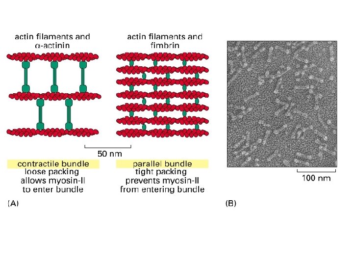 Actin elongation is mediated by formins Formation of actin bundles (as opposed to the gel-like branched actin networks) is induced by formins, which are able to nucleate the growth of straight, unbranched filaments that can be cross-linked by other proteins to form parallel bundles. Formins are dimeric proteins and each subunit has a binding site for an actin monomer. Figure 16 -36 Molecular Biology of the Cell (© Garland Science 2008)