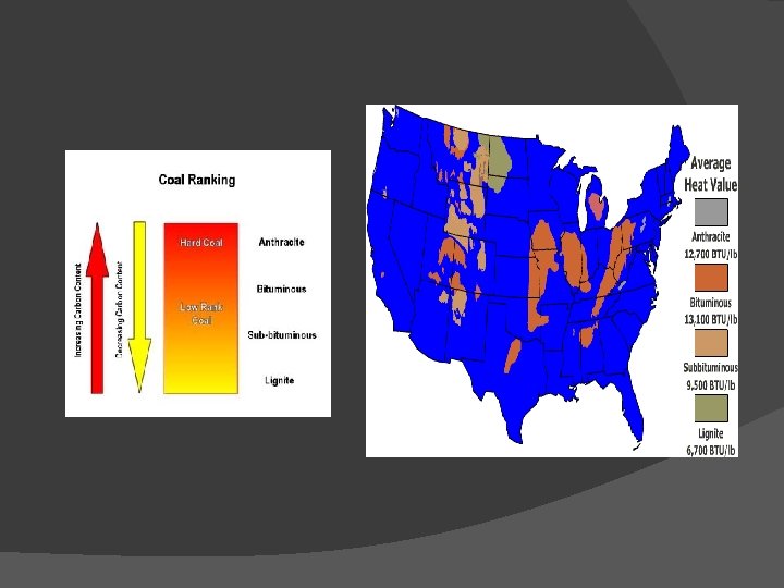 Coal Bituminous – high heat, less pollution Lignite – low quality Sulfur released after burning Acid rain
