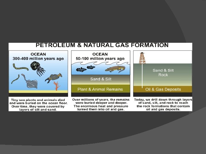 Oil and Natural Gas Decay of tiny marine organisms Ocean bottom Compressed into carbon-based molecules Trapped in porous rocks