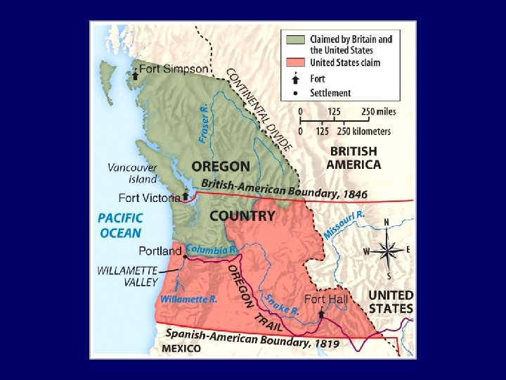 The Oregon Controversy • British claims through fur trade, occupation, and treaties with the U. S. • American claims through exploration and settlers in the Willamette River Valley • Joint occupation agreed to in Treaty of 1818 • By 1846, nearly 5, 000 Americans had caught “Oregon Fever” and moved into the region south of the Columbia River