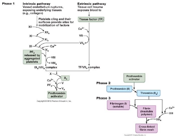 Phases of Coagulation Phase 1: Prothrombin Activator Formation (2 pathways) • Intrinsic pathway – Triggered by negatively charged surfaces such as activated platelets, collagen, or glass – Called intrinsic because the factors needed for clotting are present within (intrinsic to) the blood – Slower because it has many intermediate steps • Extrinsic Pathway – Triggered by exposing blood to tissue factor (TF) found in the tissues underneath the damaged endothelium – Called extrinsic because the tissue factor it requires is found outside of blood – Faster because it bypasses several steps of the intrinsic pathway.