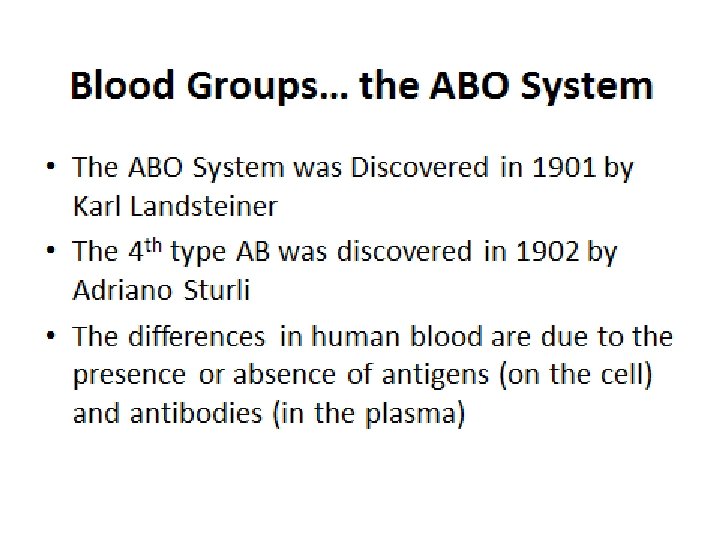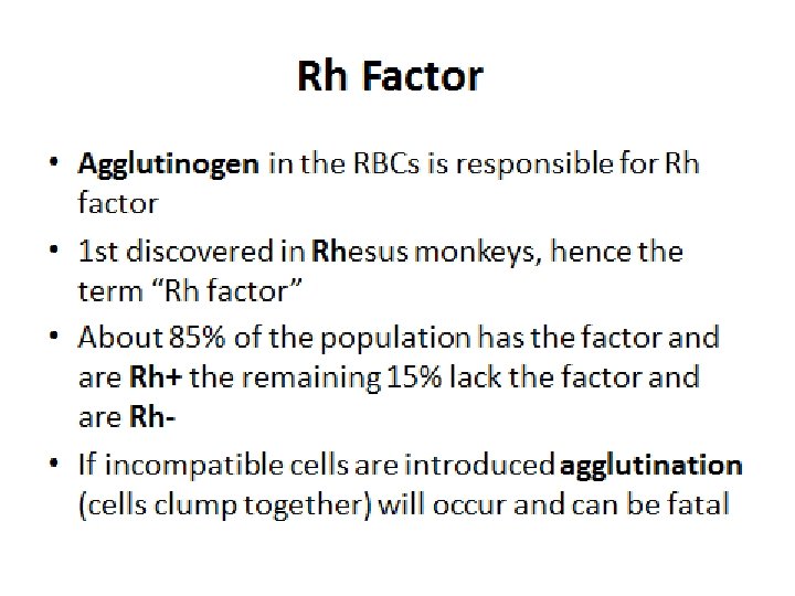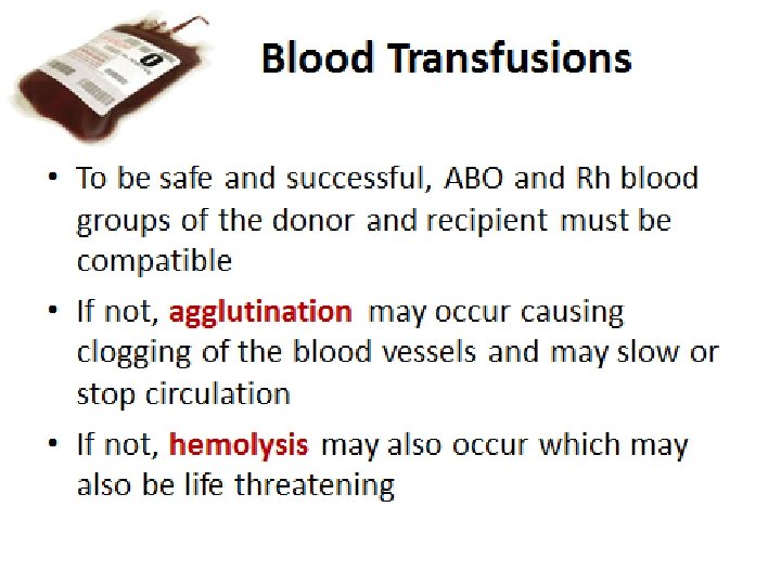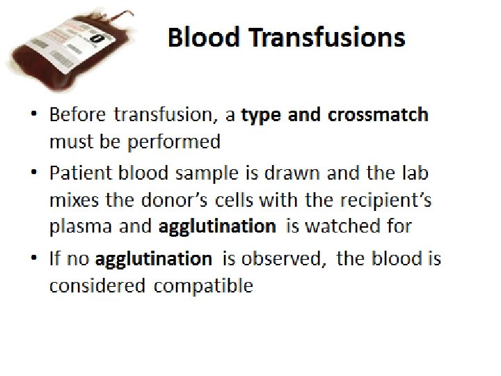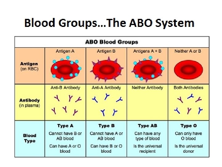 Human Blood Groups • Plasma contains antibodies called agglutinins which seek out and destroy any cells that carry agglutinogens (antigens) that are not found on a person’s own RBCs • Newborns lack these antibodies, but they begin to appear within 2 months • A person with AB blood type contains neither antibody • Type O blood contains both antibodies
