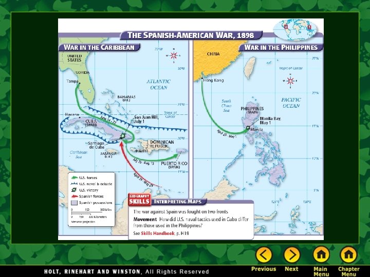 The Course of the War The Philippines Cuba • Future President Theodore Roosevelt sent Commodore George Dewey orders to prepare for war against Spain. • U. S. War Department was unprepared for war in Cuba. • Dewey engaged the Spanish fleet in Manila Bay. • American strategy was to control the port city of Santiago. • Steel- and iron-hulled U. S. ships helped to defeat the Spaniards. • Theodore Roosevelt’s Rough Riders helped gain control of the city at the Battle of San Juan Hill. • Filipino rebels, led by Emilio Aguinaldo, had already been fighting Spain. • The U. S. Navy sank the entire Spanish fleet off the coast of Cuba. • Surrounded by Dewey (at sea) and Aguinaldo (on land), Spanish forces surrendered.