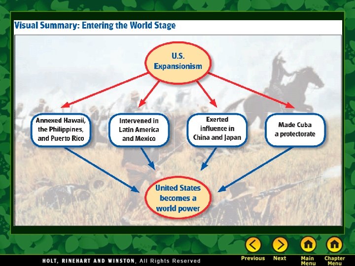 Chapter 17 – Entering the World Stage Section Notes Video The Lure of Imperialism The Spanish-American War Roosevelt and Latin America Wilson and the Mexican Revolution Entering the World Stage Quick Facts Causes of U. S. Expansionism Visual Summary: Entering the World Stage Maps The Spanish-American War, 1898 Imperialism, c. 1900 Images The Boxer Rebellion Buffalo Soldiers and Rough Riders Building the Panama Canal Annexation of Hawaii