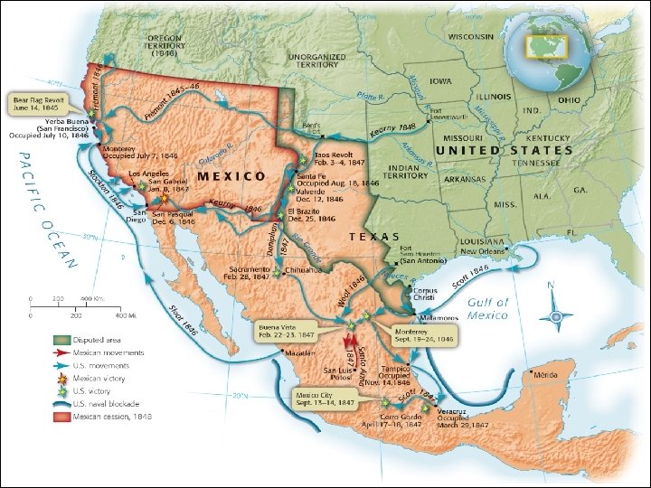 The Mexican-American War • General Zachary Taylor • April 25, 1846: “American blood shed on American soil” • Double crossing Santa Anna • General Stephen W. Kearny • Captain John C. Fremont- California Bear Flag Republic