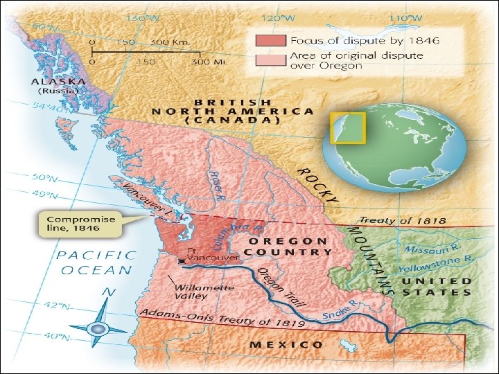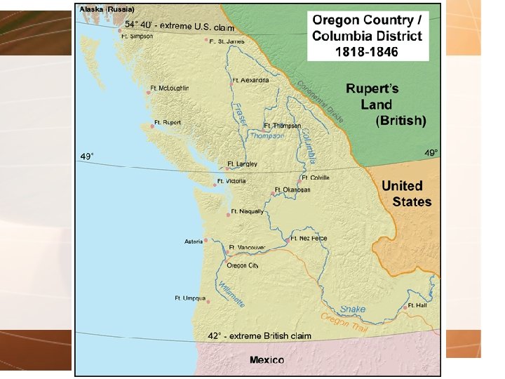 Oregon Fever • Boundary disputes – Spain – Great Britain – US • Occupation of the Willamette River Valley 49° – “Oregon Fever”